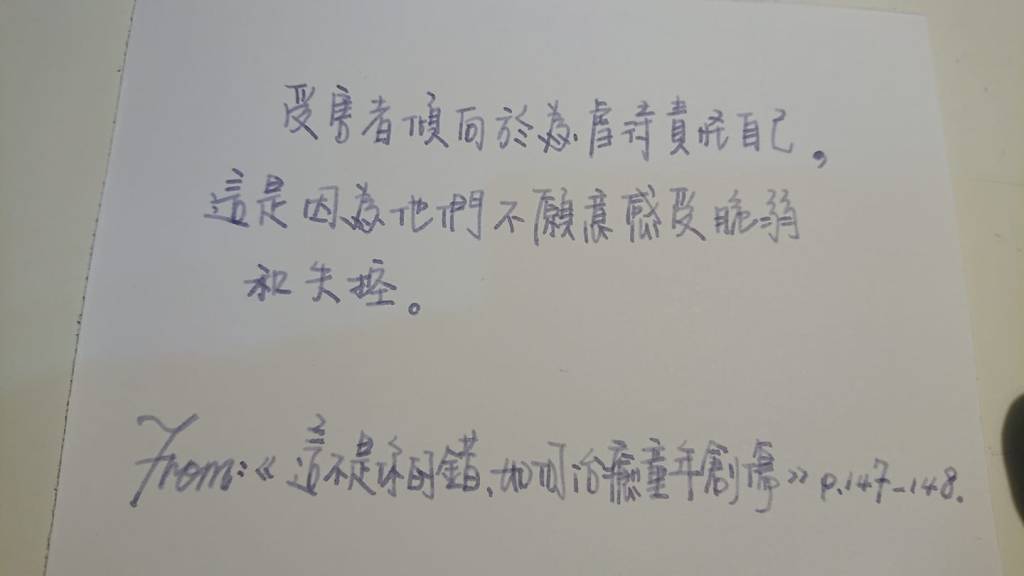 「受害者傾向於為虐待責怪自己,這是因為他們不願意感受脆弱和失控」(引自《這不是你的錯,如何治療童年創傷》,p.147-148)。
