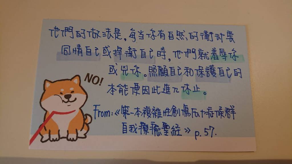 「他們的做法是,每當你有自然的衝動要同情自己或捍衛自己時,他們就羞辱你或兇你。照顧自己跟保護自己的本能便因此進入休止。」(引自《第一本複雜性創傷壓力症候群自我療癒聖經》,p.057)