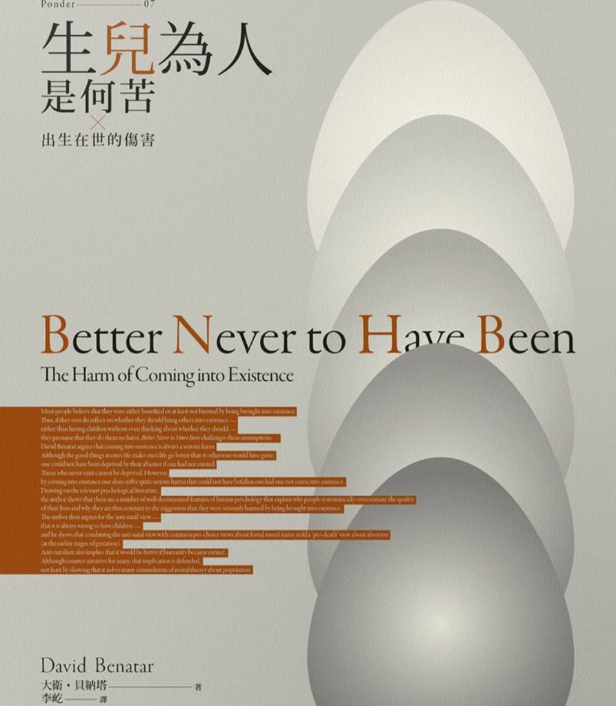雖然我常常閱讀許多非主流的作品,但假使要我從所有閱讀過的作品中挑選一本最叛逆而激進的作品,那大概會是這本《生兒為人是何苦:出生在世的傷害》。